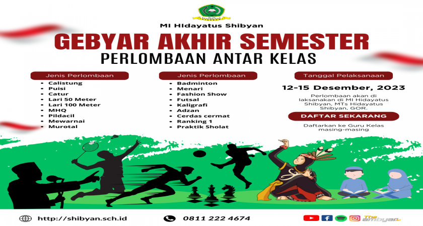 MI Hidayatus Shibyan akan melaksanakan perlombaan antar kelas, yang akan dilaksanakan pada tanggal 12 Desember 2023 sampai 15 Desember 2023.